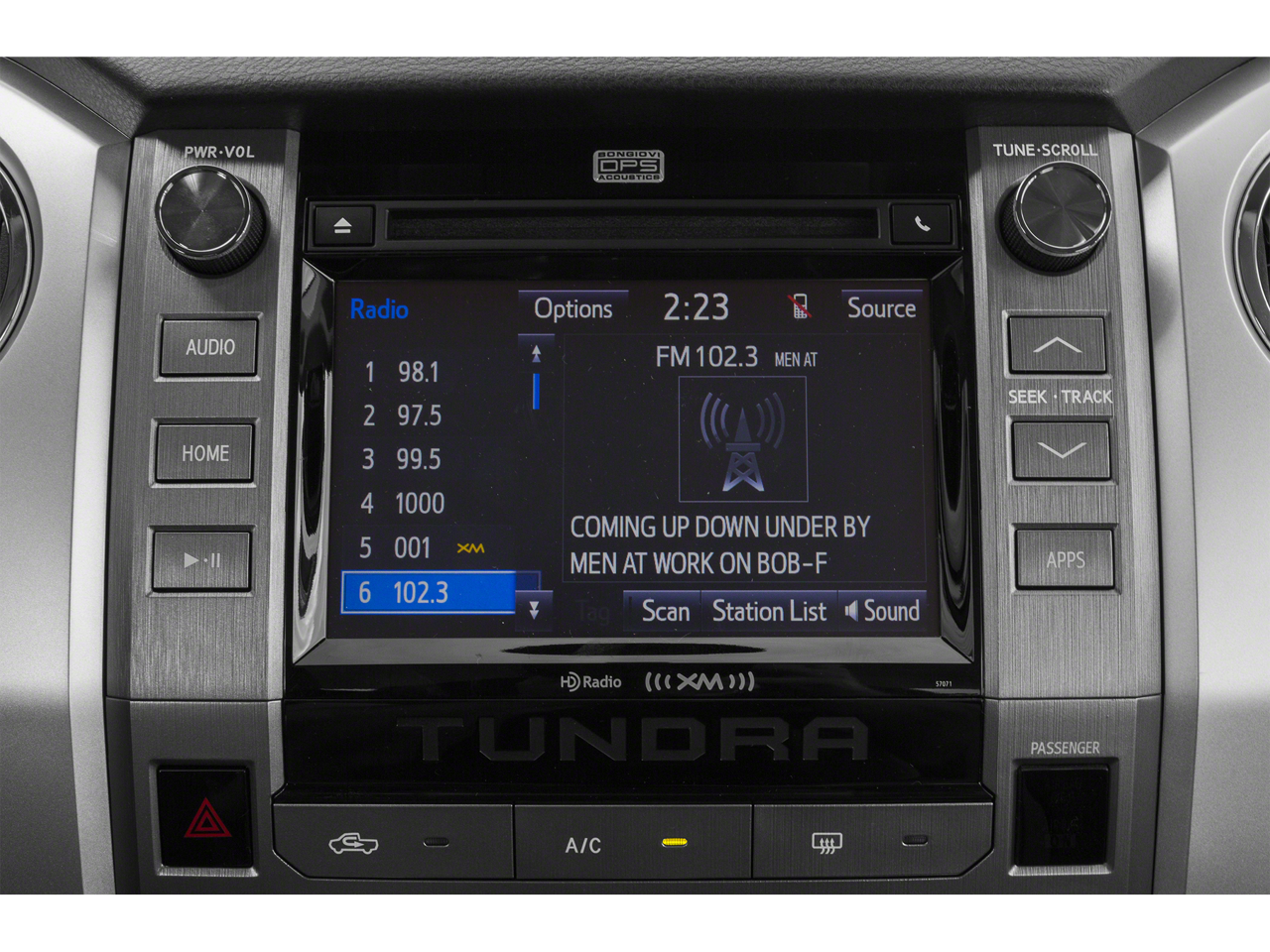 - Radio: Entune Audio Display AM/FM/HD w/CD Player -inc: MP3/WMA playback capability, high-resolution 7" touch-screen display, auxiliary audio jack, USB 2.0 port, iPod connectivity and control, iTunes Tagging, traffic and weather, Bluetooth® hands-free phone capability, phone book access, voice recognition and music streaming, SIRIUSXM Satellite Radio, 90-day free trial