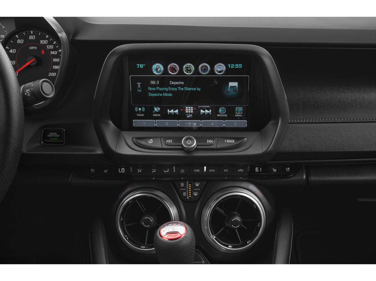 - Head-Up Display with color digital readouts for vehicle speed, selected gear, G-Force, audio system information, high-beam indicator, compass, outside air temperature, turn signals, tachometer, vehicle messages, Turn-by-Turn information and phone information